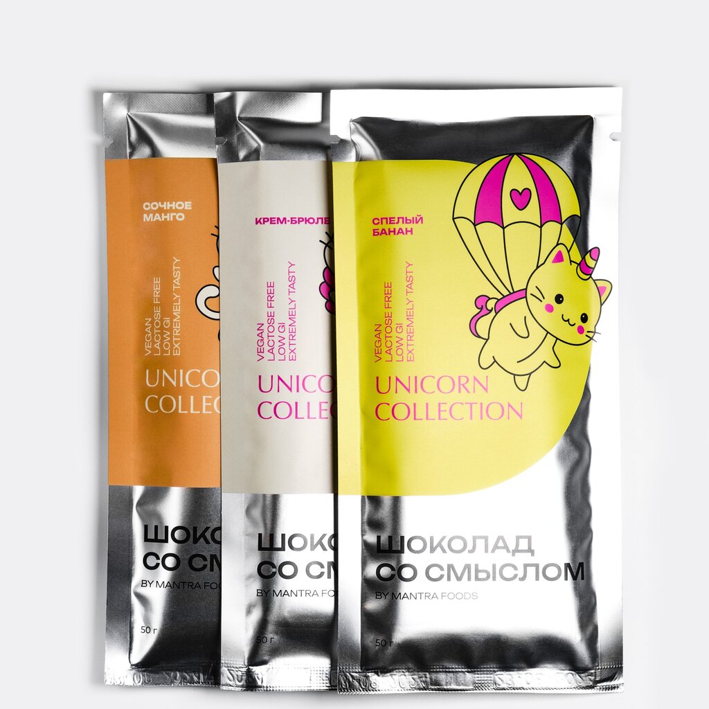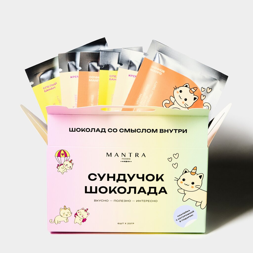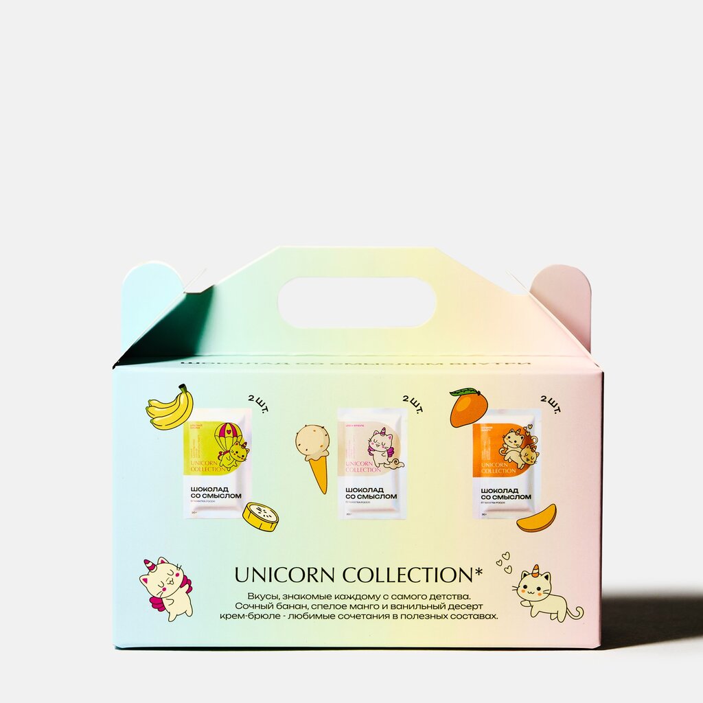 Коллекция Шоколада со смыслом "Единорожки": Крем-Брюле, Сочное Манго, Спелый Банан в удвоенном количестве в ярком радужном сундучке. Внутри приятный сюрприз — наклейка с милым Которожкой.