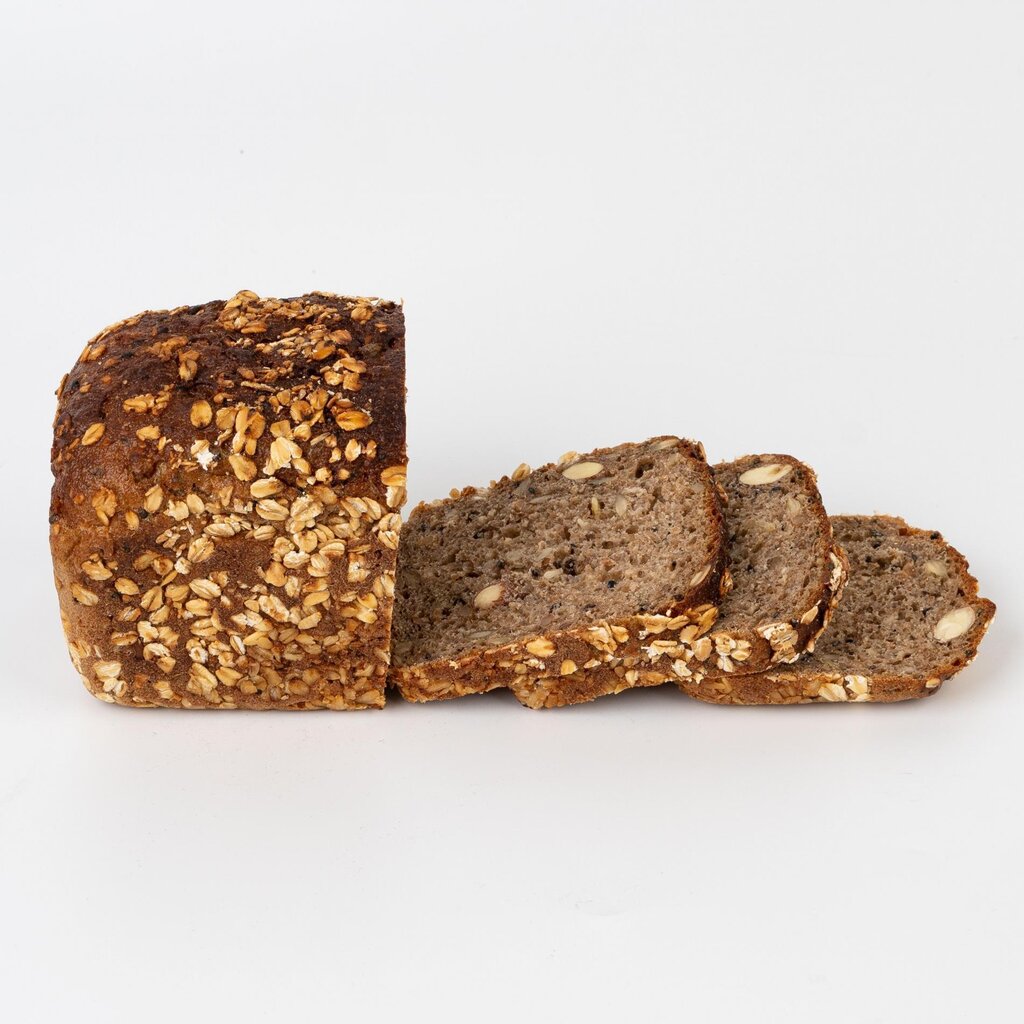 Состав: мука ржаная цельнозерновая, закваска ржаная, мука пшеничная, пшеница, рожь, соль, мед, овсянка, кунжут белый, кунжут черный, семечки подсолнечника, семечки тыквы, миндаль, семя льна.
